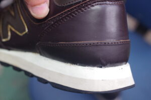 575の複雑なヒールラインに合わせるため、既存のパーツから慎重に型を執り、革を切り出します。厚すぎれば履き心地を損ない、薄すぎればホールド力が足りません。コンマ数ミリ単位での厚み調整(漉き作業)を行い、スニーカーのスポーティーな外観を損なわないよう成形しました。