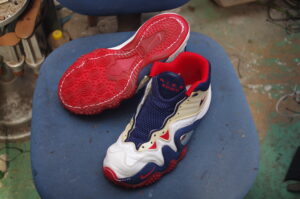 スニーカーの素材に合わせた特殊なプライマー(下塗り剤)を塗布し、熱活性を利用して強力に圧着します。