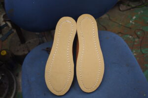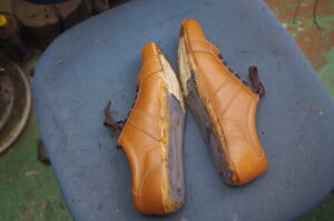 この各層を、オリジナルのソールの高さや角度を測りながら、一枚ずつ手作業で削り出し、積み上げていきます。数ミリの誤差が歩行時の「カクつき」に繋がるため、何度も水平器と目視でチェックを行い、流れるようなローリングラインを再現しました。
