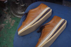 最後に、Joyaの落ち着いた色合いに合わせてサイドの色を整え、アッパーのレザーに栄養を与える保湿クリームで磨き上げると、そこには新品以上の生命力を宿した一足が姿を現しました。